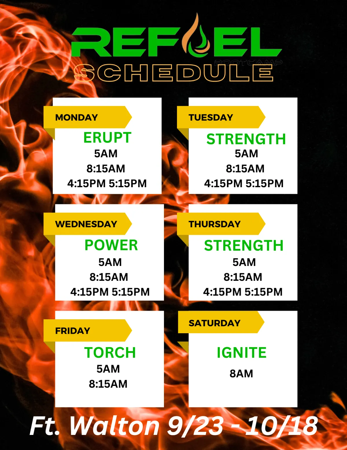 REFUEL Bootcamp is a dynamic community for all fitness levels with the shared goal of self-improvement. Our 50 minute bootcamp classes are designed to maximize strength and endurance while sculpting your body. All classes are trainer led for proper form, and visual TV's for correct exercise movements.